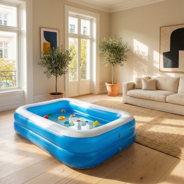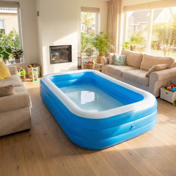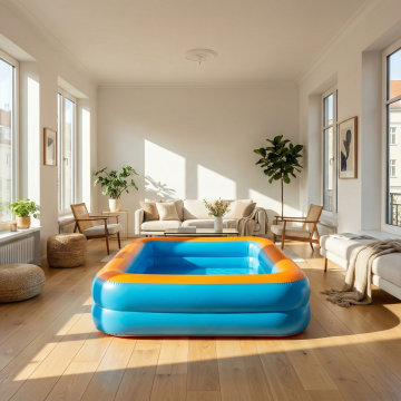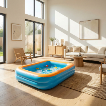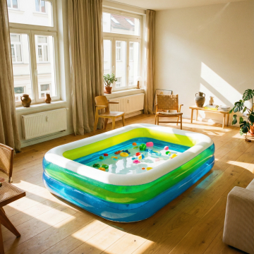 白天场景,欧美现代建筑风格,户外草坪上摆放着一个长方形的充气泳池,阳光明媚,天气很好,高对比度。色彩鲜艳。10张
