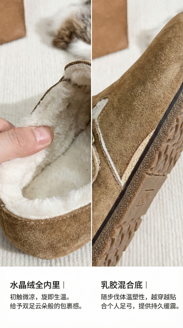 构图: 中心构图或对角线构图。聚焦于鞋子的关键部位。 内容: 展示 “牛反绒”鞋面 和 “水晶绒”内里 的对比。可以是手(模特或工作人员的手,干净、指甲修剪整齐)轻轻翻开鞋口,露出内部柔软粉糯的水晶绒。画面一侧是外部哑光细腻的反绒,另一侧是内部温暖绒绒的质感。 文案: 在图片下方简洁标注:“【外】细腻牛反绒” & “【内】温暖水晶绒”。字体为无衬线细体。