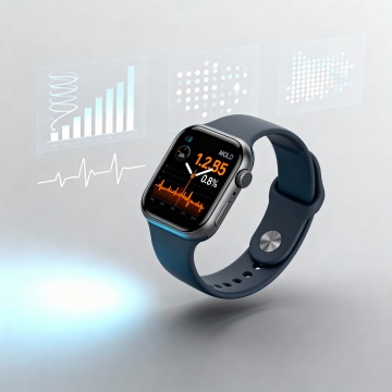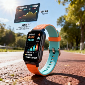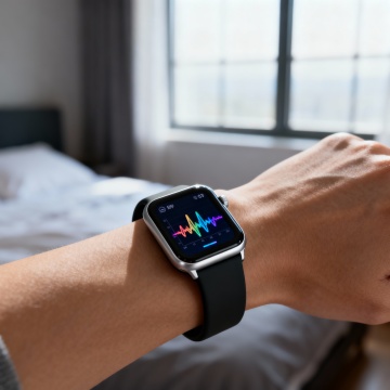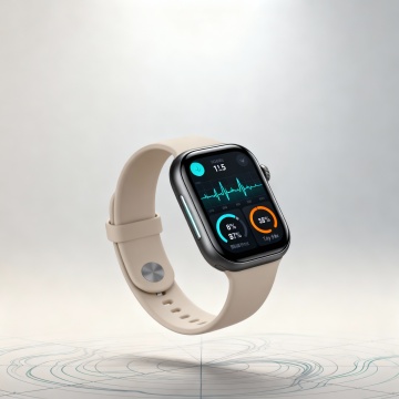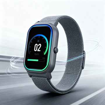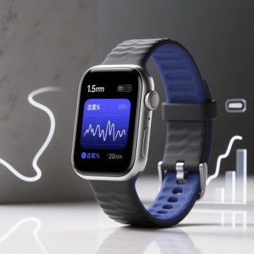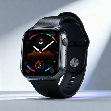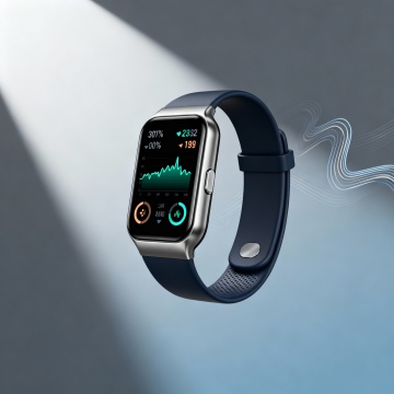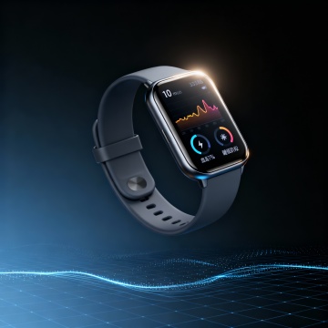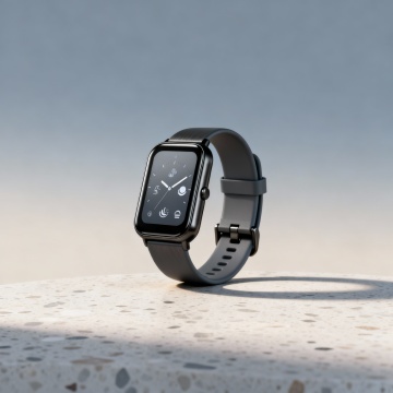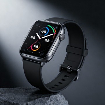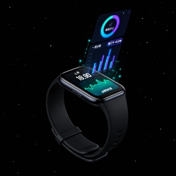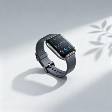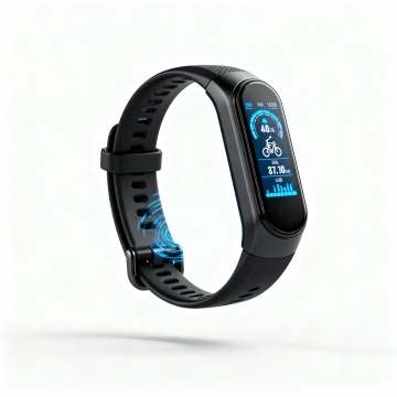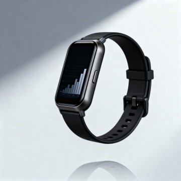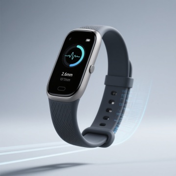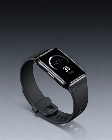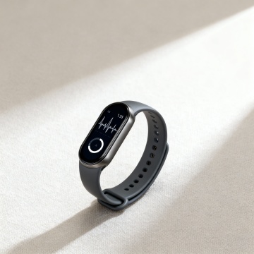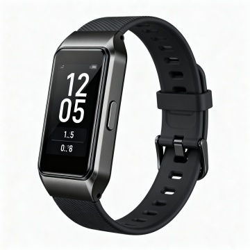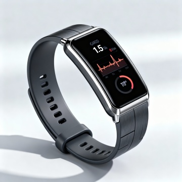 一款现代简约风格的智能手环,采用深空灰金属框架与哑光黑色柔性表带,轻盈贴合手腕。正面搭载一块1.5英寸弧形OLED触控屏,边缘微曲过渡顺滑,屏幕显示清晰的动态心率曲线与血氧数据。表身厚度仅9毫米,侧面设有隐藏式感应区,背面集成银色金属感应模组。表带采用亲肤硅胶材质,搭配细腻纹理和磁吸式卡扣,整体线条流畅无冗余装饰。