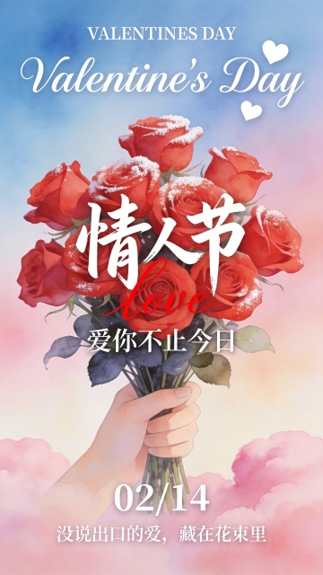 水彩风插画,梦幻柔粉蓝渐变背景,红玫瑰覆雪晶莹,手捧花束传递甜蜜浪漫。大字“情人节”与英文点缀,超现实唯美氛围,尽显爱意绵长。