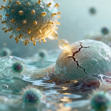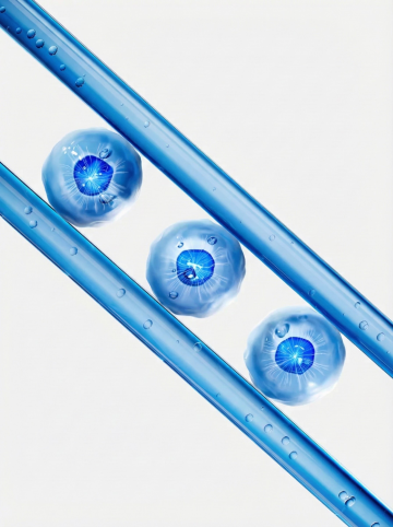 透明玻璃质感的细胞悬浮在柔和的蓝白色光晕背景中,中央细胞内部包含精致的分子结构模型,周围环绕着多个大小不一的透明气泡,一支玻璃滴管正将一滴液体滴向中央细胞,整体呈现出高度写实的3D渲染效果,光影层次丰富,高光与阴影过渡自然,营造出纯净、科技感与精密科学的氛围,画面具有清晰的视觉焦点和梦幻般的透明质感。