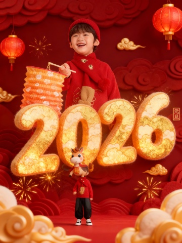 3D国潮风设计,红金配色尽显喜庆与鎏金质感,马首造型融合“2026”数字,点缀祥云与粒子笔触,重拟物手法呈现中式年味。