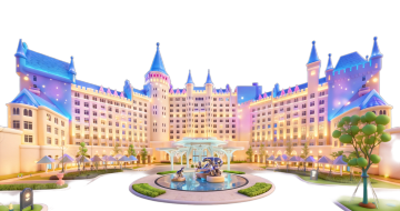 微缩艺术风结合卡通感与喜庆氛围,3D风格呈现梦幻城堡与经典角色互动场景,实景感十足,节日庆典气息浓厚。