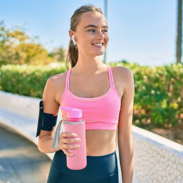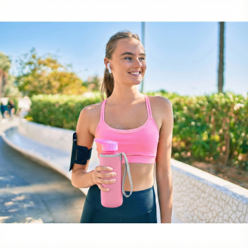 将图片一中的美女手中黑色杯套换成图片二中粉色杯套,将美女运动套装换成灰色