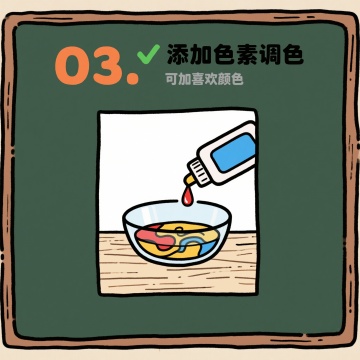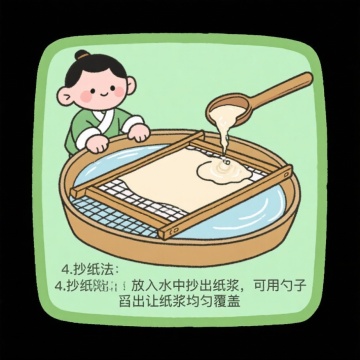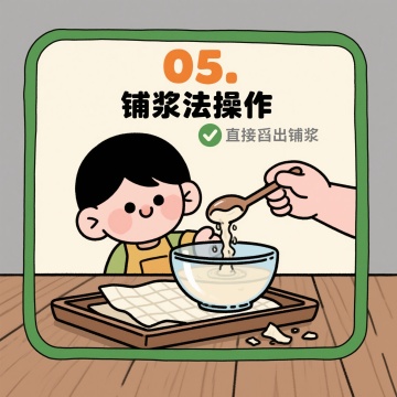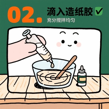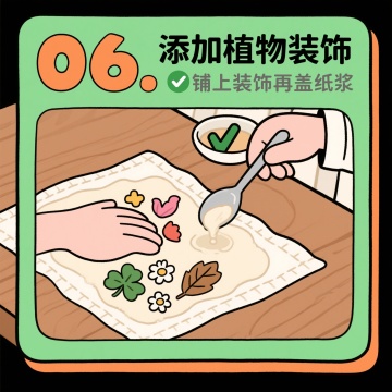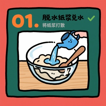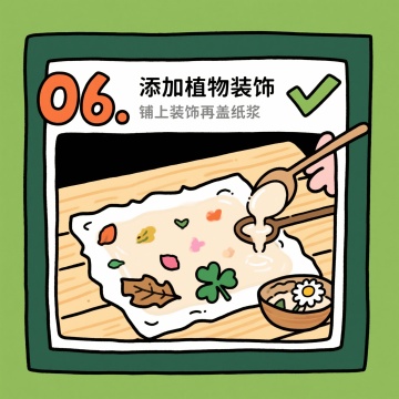 1.脱水纸浆兑水,将纸浆打散 2.滴入适量造纸胶,充分搅拌均匀 3.可加色素调色 4.抄纸法:放入水中抄出纸浆,可用勺子舀出让纸浆均匀覆盖 4.铺浆法:充分搅拌纸浆后,直接用勺子舀出铺浆 5.根据自己喜欢选择植物和装饰材料,再铺上一层纸浆水即可 6.等待晾干即可完成 参考上图风格,重新生成每一步的步骤图,要求适合小学教学,图片中不要出现卡通人物