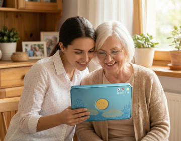 保持产品形态细节,一个欧美一家三口其中小孩正在拿着这个平板在开心的玩