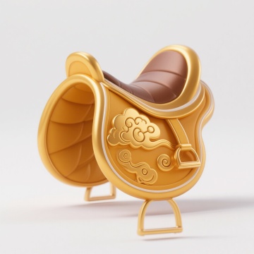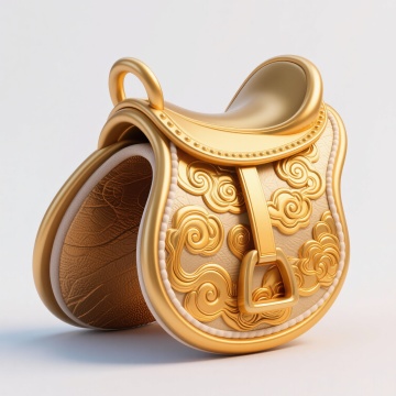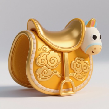 3D重拟物风融合中式元素,鎏金马与招财树在科技感光环中辉映,虚拟现实中的奢华未来新春图景。