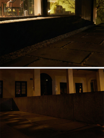 现代简约风格庭院设计,雨后湿润的黑色方形石板地面,倒映着周围绿植与建筑的光影,深色木质与黑色金属框架的现代建筑,落地玻璃门透出室内暖黄色灯光,室外黑色防腐木平台上摆放着深灰色布艺沙发组合,带有黄色靠垫,周围环绕茂密的绿色乔木与灌木,低矮的修剪整齐的草坪,小径旁点缀着小型绿植,整体呈现宁静、自然、高级的氛围,光影柔和,色彩以黑、深灰、绿色为主调,构图注重几何线条与自然元素的平衡。