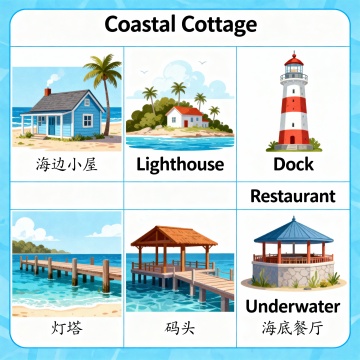 重新生成 40张英语单词学习教育主题的图片,主题为海,不限风格,上面必须有对应的英文词语和中文翻译。比例1:1
