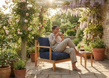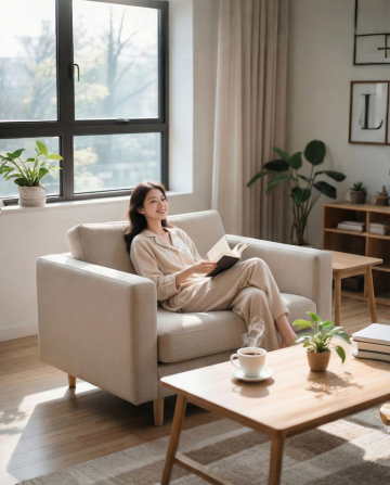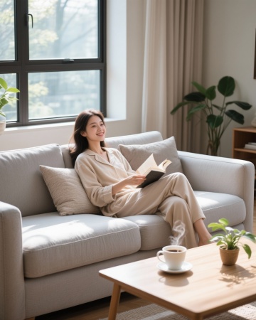 穿搭场景二 (休闲周末):女模特穿着宽松的亚麻连衣裙或针织套装,坐在自家阳台的藤椅上阅读,双脚自然交叠,鞋子是点睛之笔。