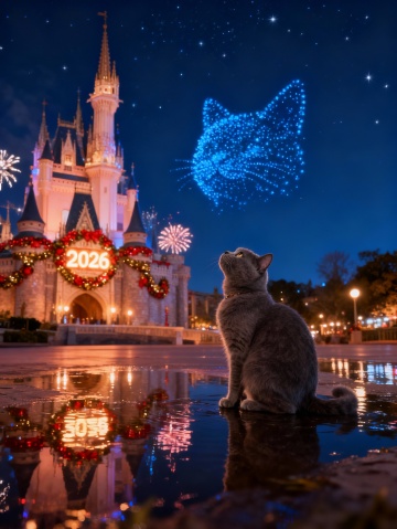 前景:参考图上的动物,蹲坐的姿势,毛发蓬松柔软,仰头望向天空,姿态优雅; 中景:2026跨年夜城堡场景,夜晚深蓝色天幕下,城堡外墙装饰红金新年花环有“2026”发光牌,城堡前的地面有积水(清晰倒映城堡灯光与烟花),整体基调为暖色;由蓝色粒子组成的参照图中的动物头部,占据上空中间四分之三的位置,造型生动梦幻; 背景:深邃夜空,点缀以星星点点的星光;