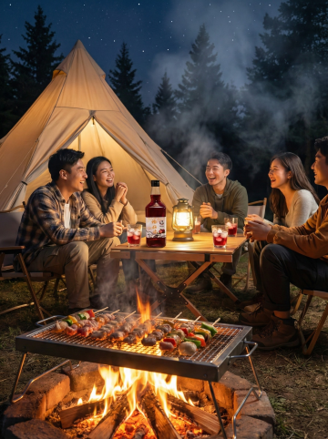 傍晚户外露营场景,白色帐篷下人们围坐在餐桌旁聚餐,帐篷顶部和四周悬挂着温暖的串灯,周围点缀着点燃的蜡烛和灯笼,营造出温馨浪漫的氛围,绿色草坪上散落着舒适的坐垫和靠枕,树木的枝叶在灯光下形成柔和的阴影,整体色调温暖,光影层次丰富,充满自然惬意的露营生活气息。