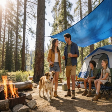 一张写实风格的露营场景照片,明亮的阳光下,湖边草地中央搭建着一个米黄色的尖顶帐篷,帐篷前摆放着一套黑色金属框架折叠桌椅,桌面上放着透明玻璃杯。远处是连绵起伏的青灰色山脉,山间点缀着墨绿色的森林,近处湖边有几棵高大的绿色松树,前景是长满黄色野花的绿色草地。天空湛蓝,飘着几缕白色的云朵,整体画面色彩清新明快,光影层次分明,营造出宁静自然、舒适惬意的户外露营氛围。