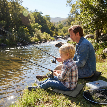 写实摄影风格,阳光透过茂密翠绿的树林洒下斑驳光影,营造出宁静自然的户外氛围,画面下方是修剪整齐的绿色草地,草地上搭建着一个白色尖顶帐篷和一个带有米色遮阳布的露营帐篷,帐篷旁摆放着原木色的折叠桌椅和藤编休闲椅,整体色调以绿色和原木色为主,光影柔和,构图采用自然的三分法,展现出舒适惬意的森林露营场景。