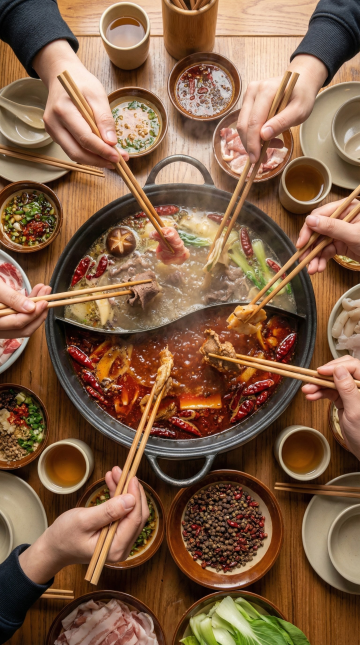 大师级摄影,高分辨率,四川火锅桌面俯拍,五双筷子同时夹菜