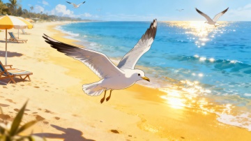 清新插画风,卡通海滩场景,木船停泊,海鸥飞翔,椰树沙滩,夏日氛围。