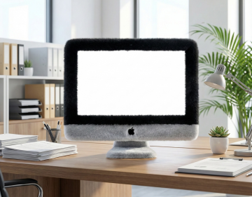 一个现代风格的电脑显示器,银色金属支架,黑色边框,整体呈现出简约、时尚的设计感。显示器屏幕为纯白色,从略微俯视的角度拍摄,光线柔和,在显示器边缘和支架底部形成淡淡的阴影,增强了立体感。背景为纯白色,没有任何多余元素,使显示器成为画面的唯一焦点,整体画面干净、整洁,具有强烈的极简主义设计风格。