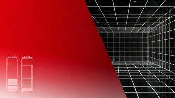 高质感3D渲染,透明亚克力外壳内整齐排列的12节圆柱形电池,金属电极清晰可见,蓝色电弧光环绕电池组,底部为带有黄色发光灯带的电路板,背景是深蓝渐变色调,地面由黑色几何方块构成,整体呈现科技感与未来感,光影对比强烈,高光细腻,材质通透,保持原元素内容,画面整体色彩变换为以深邃紫色为主调,辅以亮青色电弧光和银色金属光泽