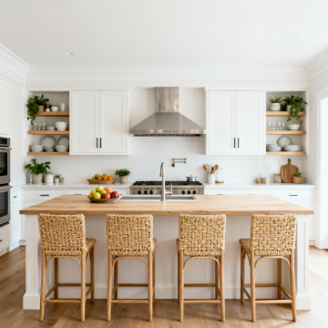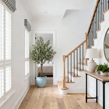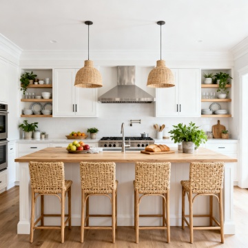 色调与材质:以白、浅原木色为主色调,搭配浅原木色地板 / 家具、藤编(椅子)、盖毯)等自然材质,质感柔和又有温度。