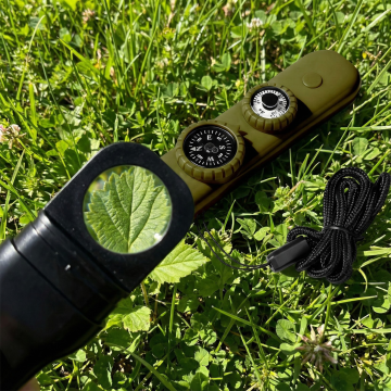 背景是夜晚森林中的地上,一支黑色战术手电筒的特写,一半的体积被雨水浸泡在水中(从地面泼溅而起,激起水花,水花晶莹剔透,折射着光线),背景是森林。
