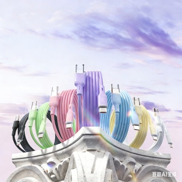 六个不同配色、不同样式、不同材质的数据线造型,采用上下两行对齐排列,浅色背景,每个数据线清晰展现USB接口和Type-C接口的细节特征,整体呈现简约干净的产品展示风格,高清晰度,光源柔和均匀,突出数据线的材质质感和设计细节,无任何文字、LOGO、电话地址及二维码。