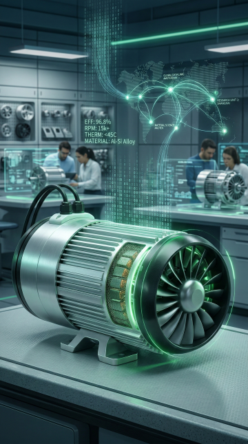 未来科技感十足的电机3D渲染图,核心为精密机械结构的电机,内部铜线圈与银色金属部件交错,表面覆盖蓝色与橙色的发光能量环,能量环呈旋转状态并带有动态光晕效果,背景为深邃的黑色空间,点缀着红色与白色的粒子飞溅,光线从右上角斜射而下,形成强烈的明暗对比,突出电机的金属质感与科技氛围,整体构图采用倾斜视角,营造出动感与力量感,展现电机在不同场景下的科技魅力与机械美学。