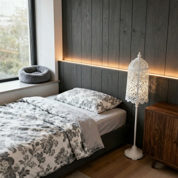 现代简约卧室,木雕风床头搭配柔和光影,性冷淡色调营造舒适温馨氛围,面料质感细腻,节日静谧感扑面而来。
