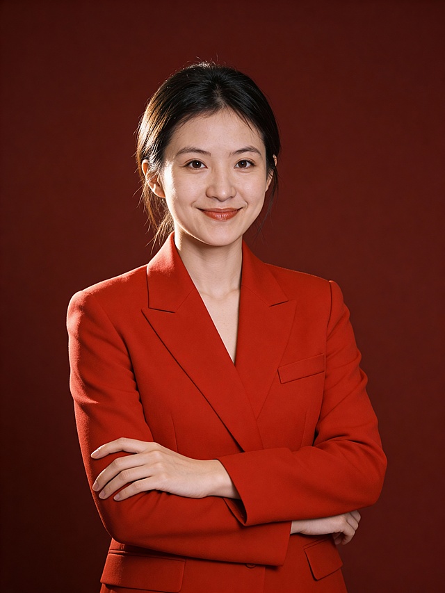 参考图中保留人物脸型、发型、年龄等特征生成职场形象照,保持人物不变,更换为红色精纺羊毛混纺西装外套,西裤同色,更换不同手势和姿势,保留耳环,简约微微暖调浅灰色纯色背景,画质超高分辨率、细节清晰,现代精致感风格;肤质精细化处理;眼神直视镜头,目光坚定且澄澈,表情自然,嘴角上扬;肤色均匀,柔光美白细腻陶瓷肌肤,哑光肤质,肤色均匀提亮;杰作,最佳画质,超高细节,写实摄影,中近景人像,皮肤细腻通透,白皙清透皮肤,柔光,正面补光,画面干净清新,高清皮肤细节;面部光比1:1.5,4800K中性光,微微修饰脸型,肤质哑光细腻,面部雾面柔光,轻透裸肌感,真实毛孔纹理;分辨率4K,严格保留原人物特征详情