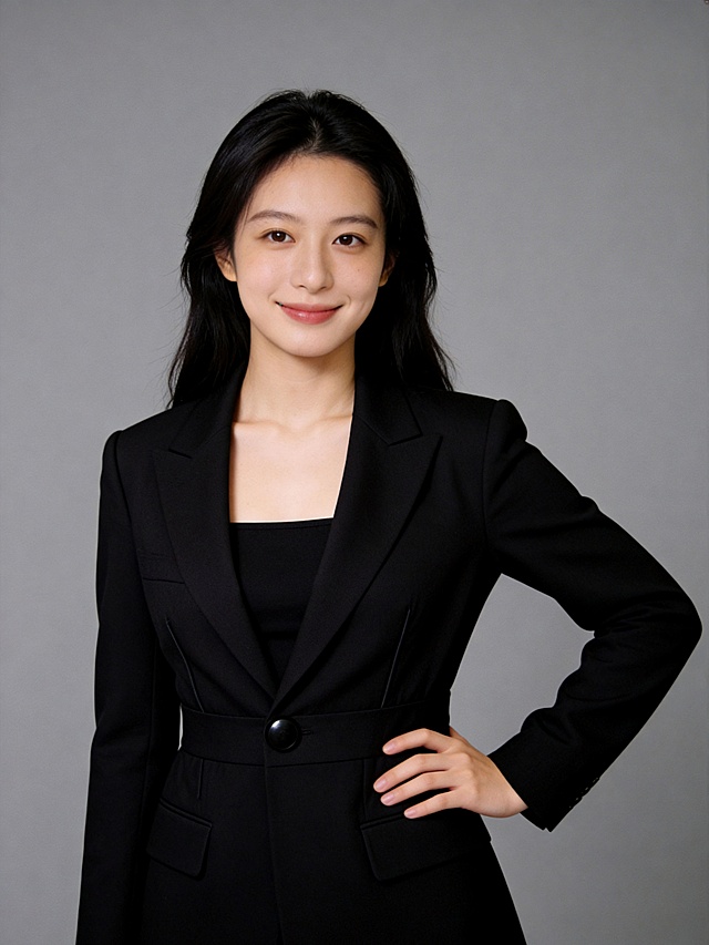 参考第一张图保留人物脸型、年龄等特征生成职场形象照,参考第二张图人物占位和比例,标准焦段50mm,F/4光圈(F/2.8-F/4区间),平视视角(镜头与人物视线齐平);人物占画面70%,人物居中(居中构图),位于画面中心,为视觉聚焦点,入境范围头部及以下至臀部下方10cm(半身像);左右留少量背景空间;头部与画面顶部保留5%空间;头部发型完整;头肩比例协调,身穿藏青灰色亚面西装外套(精纺面料),黑色V领衬衫,精致黑色细皮带搭配藏青灰色西裤。双臂自然抱胸,自信从容;主体锐利,美颜磨皮韩式精致浓妆,均匀肤色提亮肤色,站立姿势松弛随性自然,发质柔顺光泽飘逸,眼神直视镜头,目光坚定且澄澈,表情自然.嘴角上扬,气质自信从容沉稳霸气;均匀肤色,专业人像摄影写真,头部完整,结构准确;光比1:1.5,4800K暖调中性光,修饰脸型,肤质哑光细腻,面部雾面柔光,轻透裸肌感,真实毛孔纹理,32K画质,去除人物之外的所有元素,零噪点降噪,简约偏冷调中深灰度纯色背景。详情