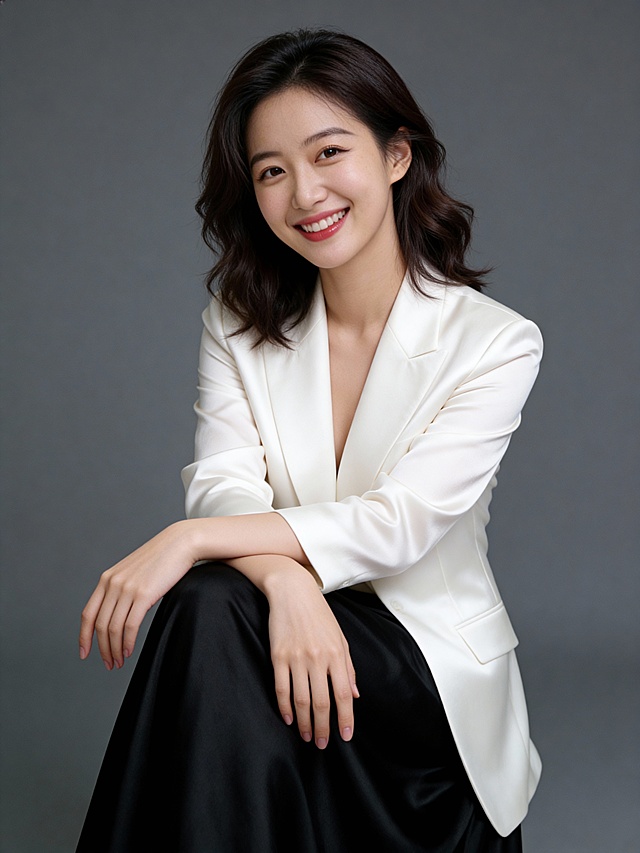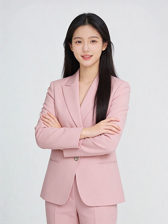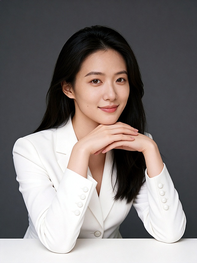 参考第一张图保留人物脸型、年龄等特征生成职场形象照,参考第二张图人物占位和比例,标准焦段50mm,F/4光圈(F/2.8-F/4区间),平视视角(镜头与人物视线齐平);人物占画面70%,人物居中(居中构图),位于画面中心,为视觉聚焦点,入境范围头部及以下至臀部下方10cm(半身像);左右留少量背景空间;头部与画面顶部保留5%空间;头部发型完整;原生肤质白皙细腻(通透自然),韩式精致浓妆(整洁清透通勤妆容,底妆轻薄整洁,浅淡暖调唇色提升气色,无浓重妆感;身穿奶油净白色宽松版型西装(精纺羊毛混纺材质),内搭白色圆领T恤(休闲感,细腻亚面纯棉材质),同色系西裤(精纺羊毛混纺材质);双臂交叉于胸前,站立姿势(重心略偏一侧更显随性);温婉沉稳,发质柔顺光泽,弧度自然,整体气质自信从容,兼具职场利落与女性温婉沉稳;眼神直视镜头,瞳孔澄澈带柔和光感,表情自然,嘴角微微上扬,画面整体简约高级,为专业棚拍人像写真,采用柔和自然布光,4800K中性光色温,面部光比精准控制1:1.3,面部光线均匀通透;主体锐利清晰,简约冷调中灰度纯色背景(光线呈现均匀柔和干净的质感),严格按照第一张图内容生成。详情