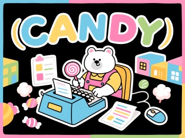 字母 “C”“A”“N”“D”“Y” 组成糖果小镇,打工人是穿着糖果色工装的小熊,在棒棒糖打字机前工作,周围有糖果做的报表、棉花糖鼠标,潮流撞色,描边插画风格,传递甜蜜又努力的萌趣职场感
