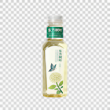透明PET材质饮料瓶,瓶身呈柔和曲线造型,瓶盖为黑色螺旋盖,瓶身下半部分渐变色彩(可尝试清新蓝、活力橙、静谧绿等不同配色),瓶身中央有立体感的水果图案(如青柠、葡萄、西瓜等不同样式水果),水果表面带有水珠和气泡效果,背景为纯净浅色,整体画面简洁清爽,突出产品主体,具有现代饮料包装的设计感和吸引力。