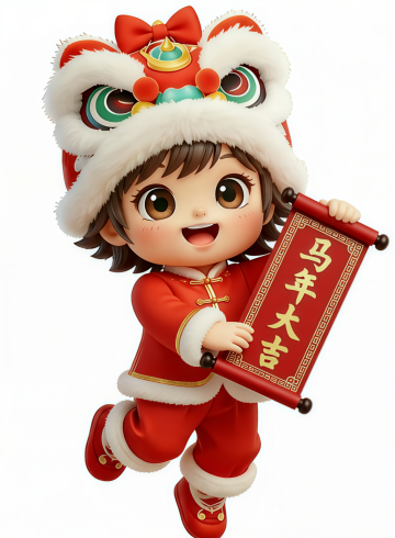 扁平风剪纸风格,融合拟人化财神与舞狮红包,喜庆卡通元素传递春节祝福。