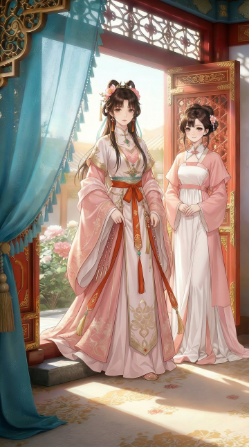 保持图2图3角色画风固定,风格不变,质量不变,根据图4线稿生成在图1场景中的动作,白天,上半身,站立,左侧线稿图3女,站立,身体微微面向画面右侧,面无表情,右侧线稿图2,站在图3女子身后,看着图3女子,焦急的神态