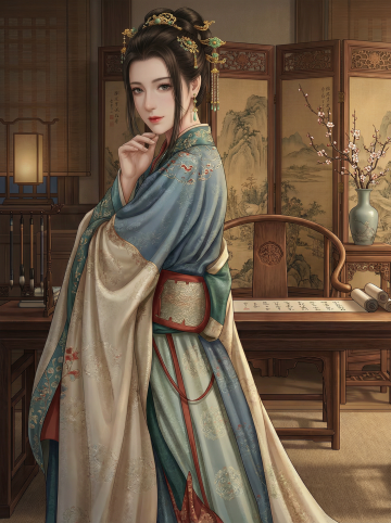 工笔风与插画风融合,古典中式美人执扇临窗,光影交织,莲影婆娑,尽显优雅浪漫与静谧唯美感。