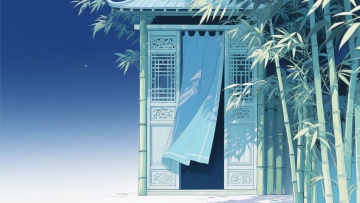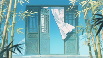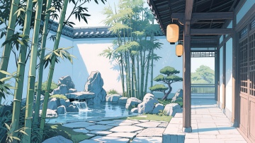 二次元古风,竹子庭院,浅蓝色为主,细节丰富,生成2张,不要人,4k,16:9