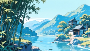 古典中式园林,水彩插画风,清新唯美,花木繁茂,流水潺潺,尽显雅致。