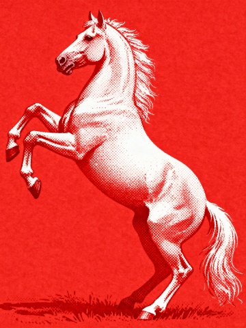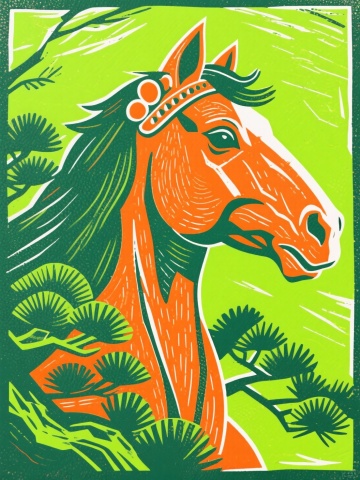 传统年画,版画,保留木版年画的线条感,奔腾跨越的马,祥云、火焰纹环绕,以深蓝色为沉稳背景,主体采用橙黄与红色,细腻的数字手绘质感。线条流畅且富有变化,模仿了传统线描的韵味。色彩渲染均匀平滑,但背景保留了细微的笔触感