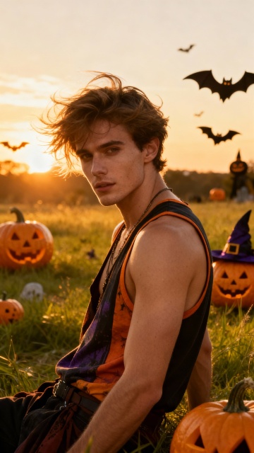 欧美帅气模特,万圣节氛围,万圣节潮流装饰,露出手臂,万圣节元素点缀背景,户外,草地,夕阳,微风