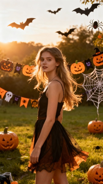 双色条纹毛衣搭配南瓜发饰,轻拟物风与实景感结合,营造出喜庆、可爱又梦幻的万圣节氛围,温暖治愈中透着趣味。