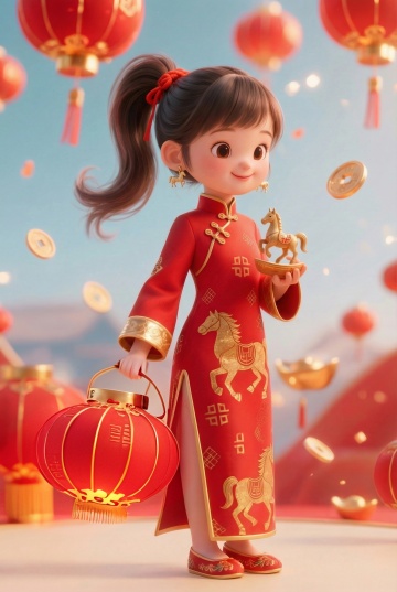 C4D 建模风格,2026 新年恭贺主题 IP 形象,可爱元气的高马尾小女孩,齐刘海 高扎红色丝带蝴蝶结马尾,灵动杏眼笑眼弯弯,脸颊带喜庆红晕,身穿喜庆正红色国风新中式连衣裙,衣摆点缀金色祥云纹样与马纹刺绣,融合生肖马元素 —— 女孩肩头趴伏一只萌态卡通小马,小马通体赤红配鎏金纹路,与女孩造型呼应,整体造型圆润饱满,3D 立体质感,光影通透柔和,金属质感与布艺质感细腻,新年喜庆氛围拉满,色彩以大红 鎏金为主色调,背景点缀浅金祥云与新年烟花,构图居中,高清 8K,细节拉满,IP 形象商用级设计,简洁干净背景,萌系治愈风格