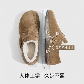 布局:左文右图。左区深灰底,右区鞋侧特写。 文案模块: text 表层|牛反绒 指尖轻触的绵密颗粒感 内里|水晶绒 步履间的恒温云触感 视觉:箭头指向鞋面/内里材质焦点区。