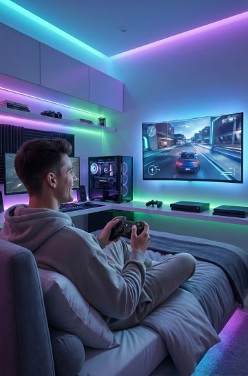 一个现代简约风格的客厅场景,阳光透过巨大的落地窗洒入,木地板泛着温暖的光泽,浅灰色的布艺单人沙发搭配黑色皮质脚凳,原木色的电视柜上放置着一台超薄智能电视,电视屏幕上显示着一个宁静的湖泊日落景色,湖面上有一艘小船,远处是连绵的山峦和橙红色的晚霞,天空中飘着几朵云彩,电视下方的应用图标清晰可见,电视柜上摆放着两个简约的黑色陶瓷花瓶,窗外可以看到城市的远景和山脉轮廓,整体氛围明亮、通透、舒适,具有高度的真实感和细腻的光影表现,光线从画面右侧窗户射入,在地面和家具上形成柔和的阴影和高光,色彩以原木色、灰色、白色为主调,搭配屏幕上日落的暖色调,构成和谐统一的现代家居美感。