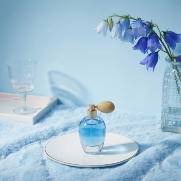 玻璃风重拟物设计,渐变蓝瓶身搭配黑色几何瓶盖,简约主义美学,营造奢华优雅的实景质感,时尚感十足。