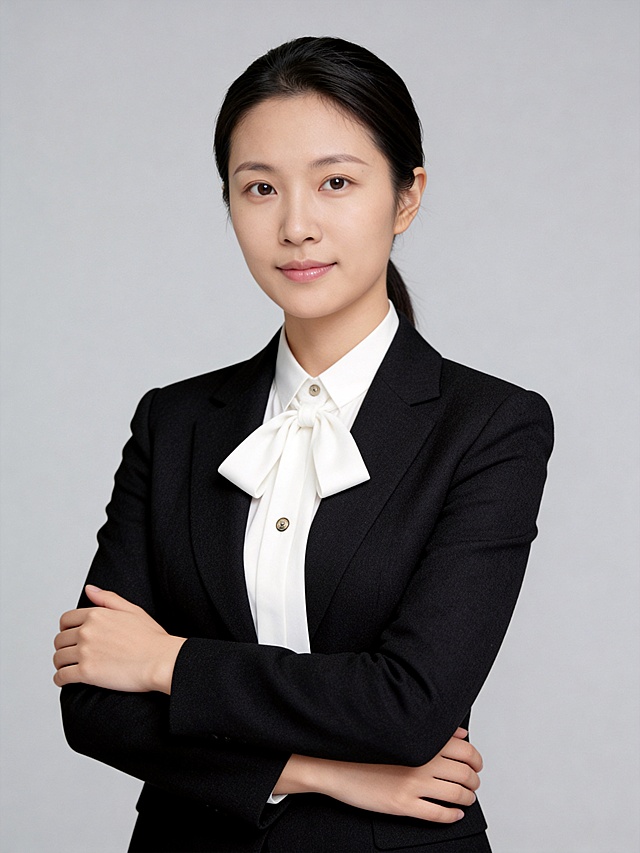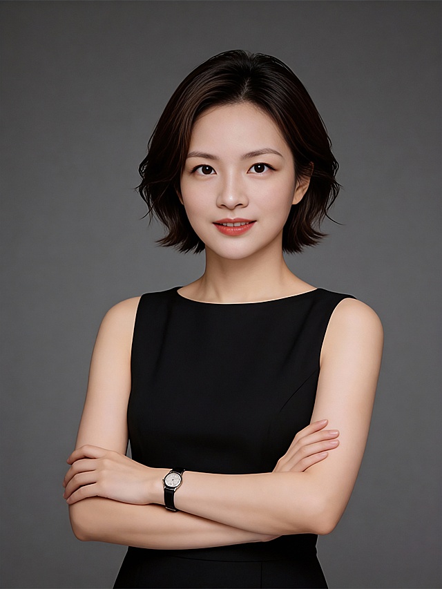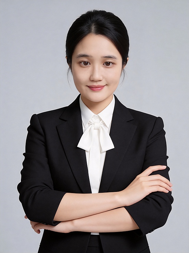 画面主体是一位面带微笑的东亚女性:留着干练的深棕色短发,妆容精致(唇色是明亮的红色),佩戴着小巧的金色耳饰,气质亲和又专业。穿了一身黑色的西装套装,内搭白色衬衫,搭配了一条浅米色的装饰性领带,整体造型正式且利落。她双臂交叉放在身前,表情温和自信,背景是纯净的白色详情