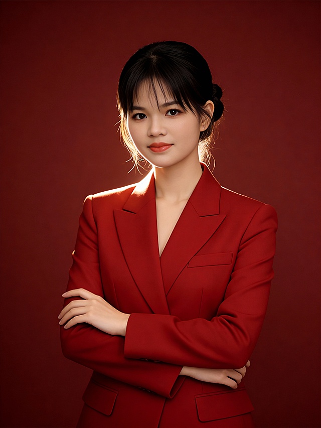 参考第一张图保留人物脸型、年龄等特征生成职场形象照,参考第二张图人物占位和比例,标准焦段50mm,F/4光圈(F/2.8-F/4区间),平视视角(镜头与人物视线齐平);人物占画面70%,人物居中(居中构图),位于画面中心,为视觉聚焦点,入境范围头部及以下至臀部下方10cm(半身像);左右留少量背景空间;头部与画面顶部保留5%空间;头部发型完整;肤质白皙细腻,头肩比例协调,美颜磨皮韩式精致自然的浓妆,均匀肤色提亮肤色,暖调通透水光肌,零粉感伪素颜底妆,肤质细腻无毛孔,暖调白皙,肌表带自然润泽高光,暖调杏粉色哑光眼影轻扫眼睑(仅提亮轮廓),极细内眼线(填充睫毛根部),自然深棕带细微高光点美瞳;唇妆:哑光橘红色口红,唇色饱满浓郁,唇面细腻粉质柔焦感,唇部水润,自然好气色无妆感边界;身穿深黑色无袖简约高级设计感连衣裙(长裙),搭配细黑色表带的精致手表;发质微微蓬松有质感,造型干练优雅,双臂交叉于胸前,肢体舒展规整,自信从容;发质柔顺光泽自然飘逸, 站立姿态,表情自然,目光坚定且澄澈,眼神明亮直视镜头,肢体放松自然,气质自信从容大气;均匀肤色,专业人像摄影写真,头部完整,结构准确;光比1:1.5,4800K中性光,修饰脸型,肤质哑光细腻,面部雾面柔光,轻透裸肌感,真实毛孔纹理,32K画质,去除人物之外的所有元素,零噪点降噪,简约中深灰度纯色背景。严格按照第一张图内容生成。详情