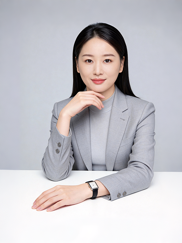 参考图中保留人物脸型、发型、年龄等特征生成职场形象照,标准焦段50mm,f/4光圈,平视视角,人物占画面70%,人物居中,半身像,左右留少量背景空间,头部与画面顶部保留5%空间,头部发型完整,头肩比例协调,人物结构准确。发质微微柔顺,微微蓬松。身穿白色精纺羊毛混纺休闲西装外套,平驳领设计,面料呈细腻微微哑光质感;内搭简洁基础款,下装白色精纺羊毛混纺休闲西裤;着装正式干练;专业沉稳,气质亲和干练,身形匀称,姿态端正,身体挺拔。呈右手轻握西装前襟的自然姿态,肢体放松且自信。佩戴精致珍珠耳环。简约微微中度灰色纯色背景,背景光线均匀柔和,强化色彩对比的高级感,极简干净。32k画质超高分辨率、细节清晰,现代精致感风格;肤质精细化处理;眼神直视镜头,目光坚定且澄澈,表情自然,嘴角上扬。清透自然裸妆,妆感轻薄轻透裸肌感,通透感肤质,肤色均匀白皙,雾面柔光裸肌感,保留真实毛孔纹理,自然提亮。正面柔光补光,4800K中性光,面部光比1:1.5,色调明亮。中近景写实摄影,对焦清晰,高清保留皮肤细节。分辨率4K,去除人物之外的所有元素。严格按照图片内容生成。画面比例3:4详情
