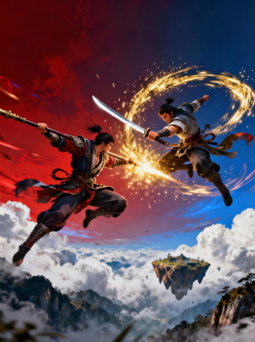 梦幻古典中式插画,仙人御剑飞行,云海缭绕,水墨风格渲染虚拟现实。
