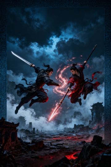 热血感十足的古典武士,手持血刃,战场硝烟中展现超现实主义的故事感。