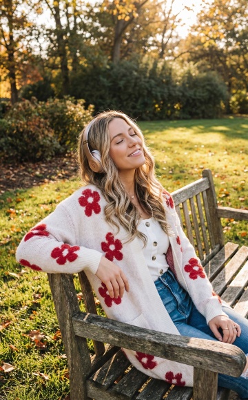 保持产品形态细节特征,一位欧美女士坐在户外拿着这个手机正在打电话,背景有橙色的枫树